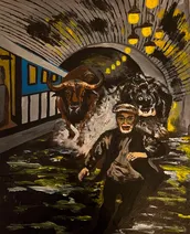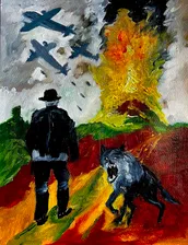 Un homme rêve qu'en se regardant dans un miroir, il s'est tranformé en kangourou. Dans le ciel volent des corbeaux atteints d'hémorragie. Huile sur papier 2025. ES.