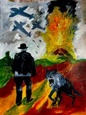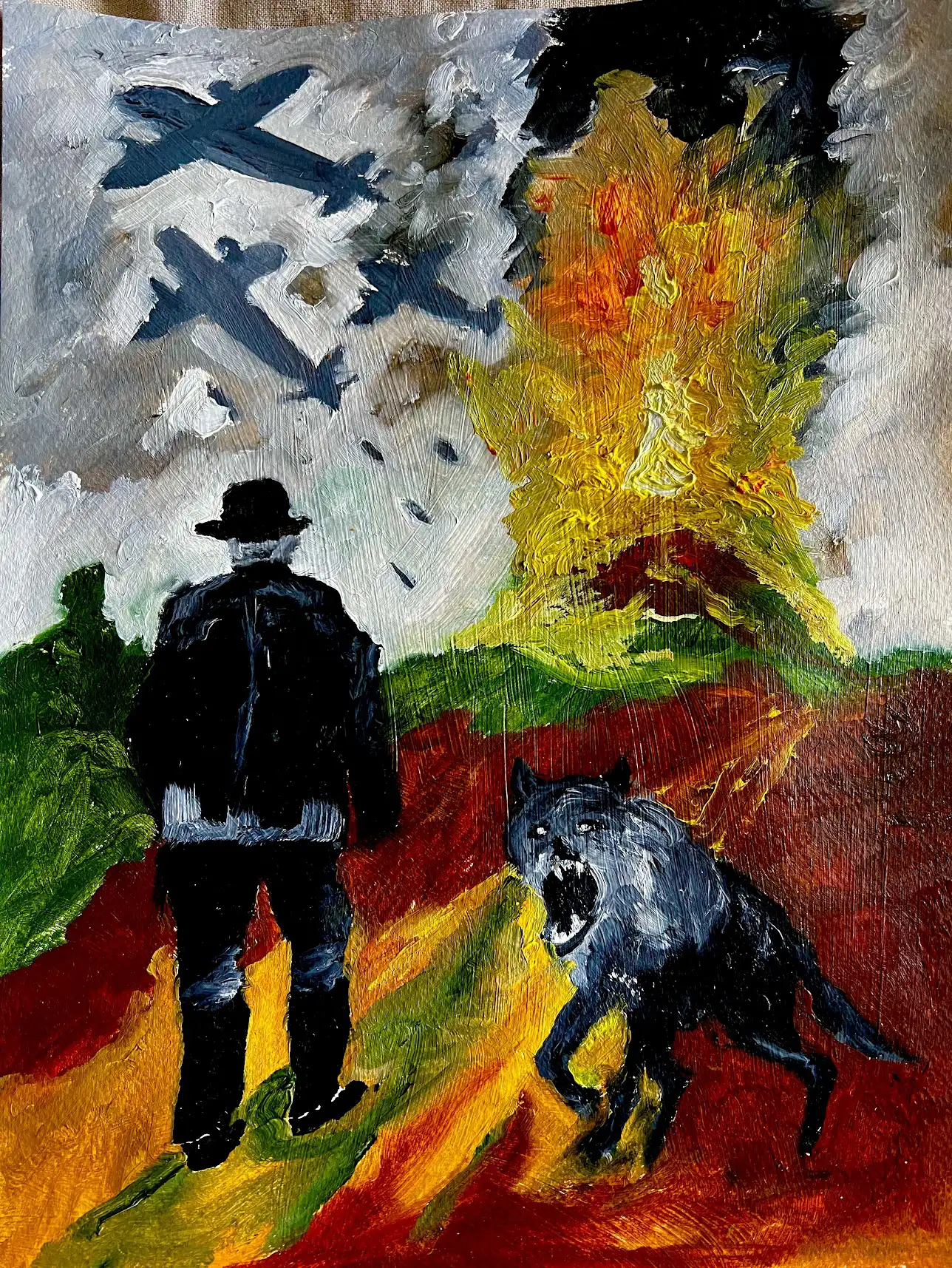 Un homme rêve qu'en se regardant dans un miroir, il s'est tranformé en kangourou. Dans le ciel volent des corbeaux atteints d'hémorragie. Huile sur papier 2025.