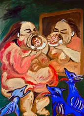 Grosse femme entourée de chiens. Huile sur toile. octobre 2025.