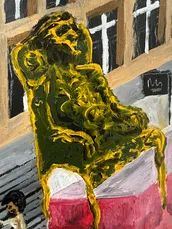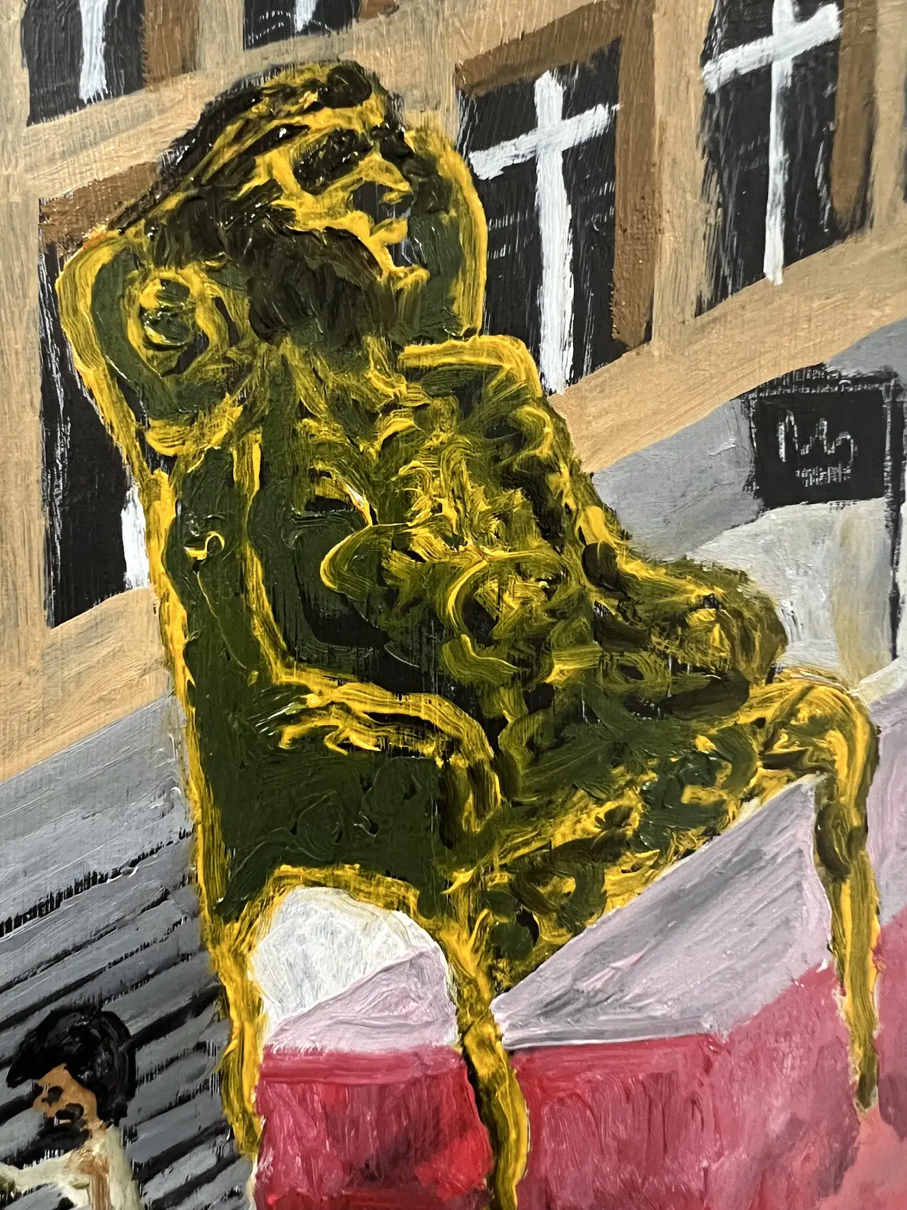 Un homme rêve qu'il se jette par la fenêtre et se transforme en vieux fauteuil. Huile sur papier 2025.