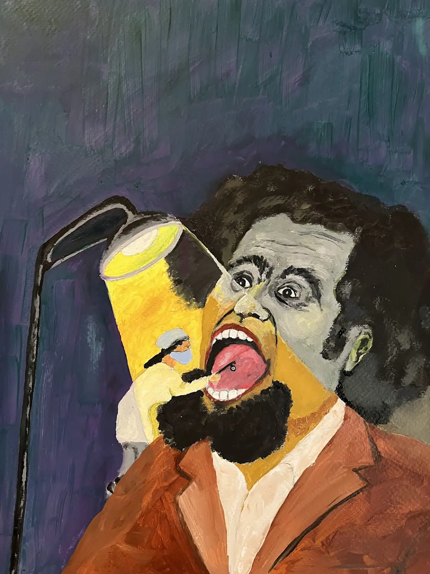 Un homme rêve qu'il est enfermé dans une boîte de bonbons tandis qu'un chien le scalpe. Un pianiste bossu joue en sourdine. Huile sur papier 2025. ES.